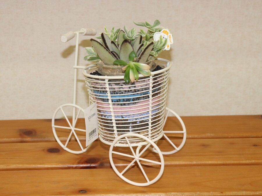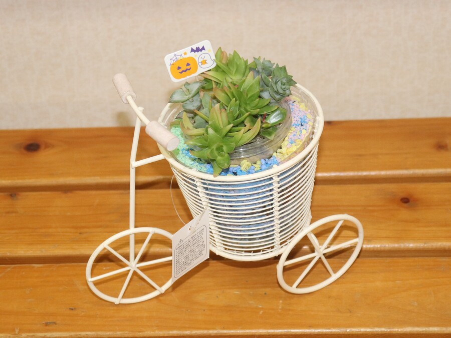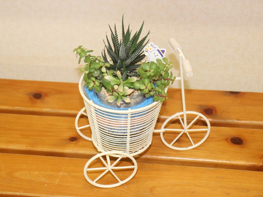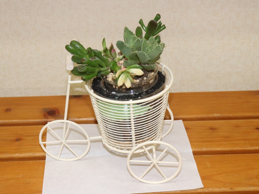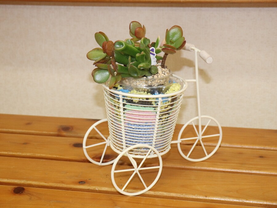 2種類の多肉植物を選び、透明なプラコップに植え込んだ後、一回り大きい容器に底のない透明プラコップを入れて固定し、その隙間にカラフルなカラーサンドを入れました。ワイヤーで出来た器もかわいくて素敵な仕上がりになりました。