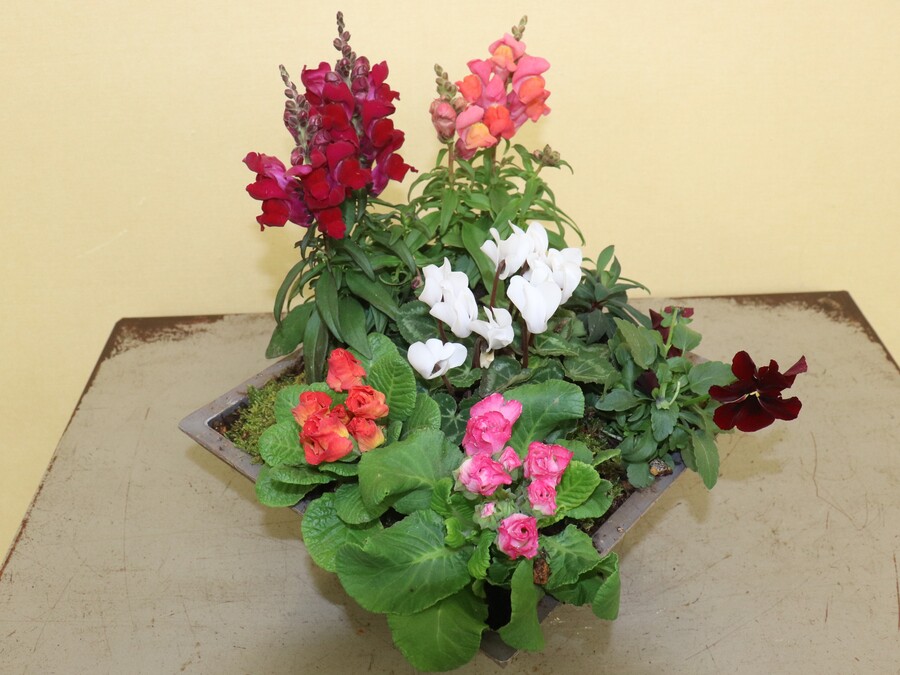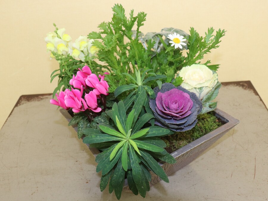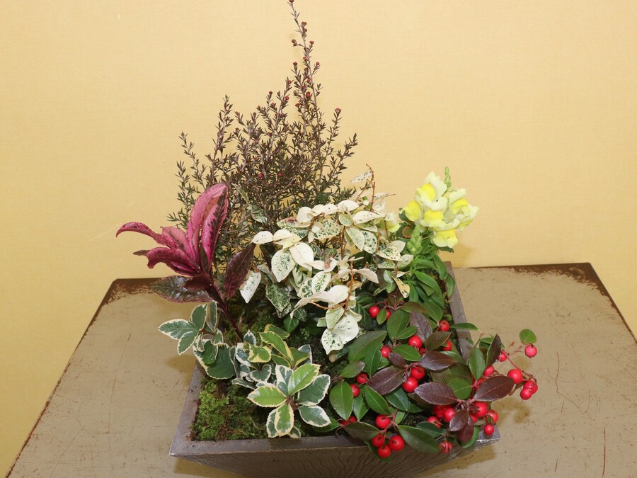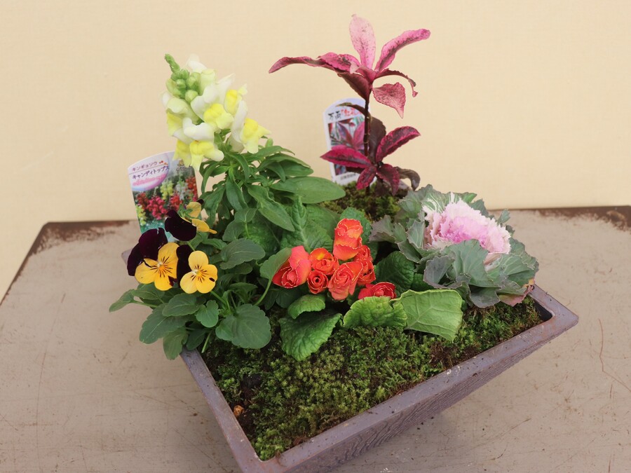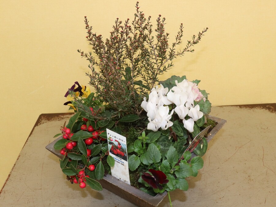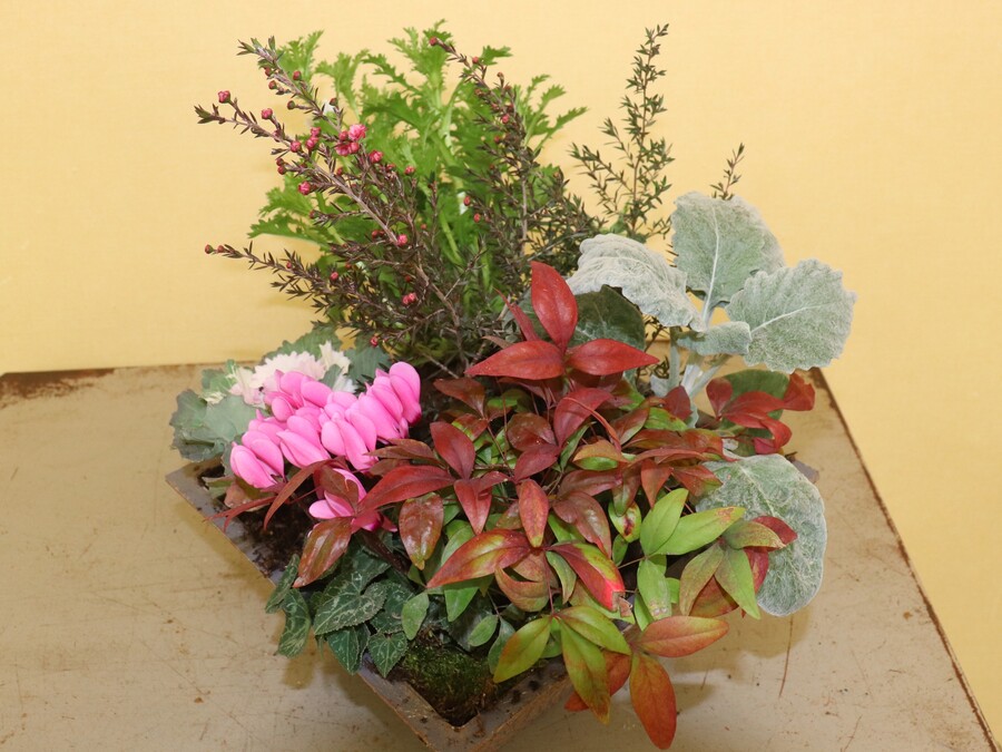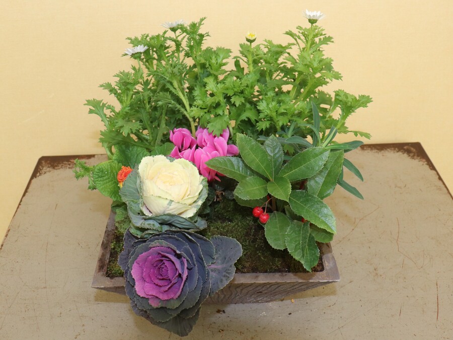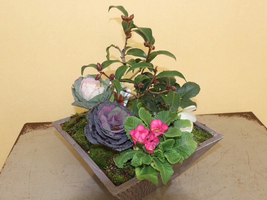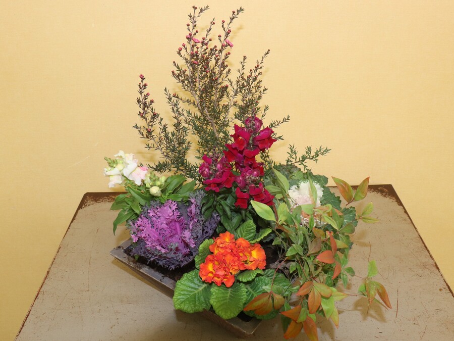 今年度最後の花の講座は、恒例の「正月飾りの寄せ植え」を行いました。